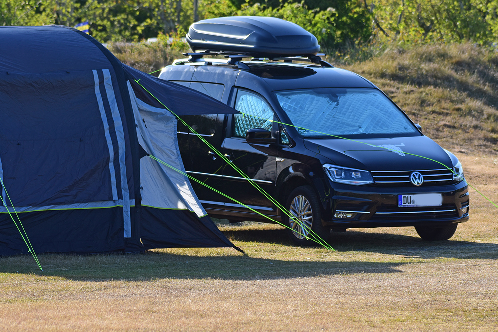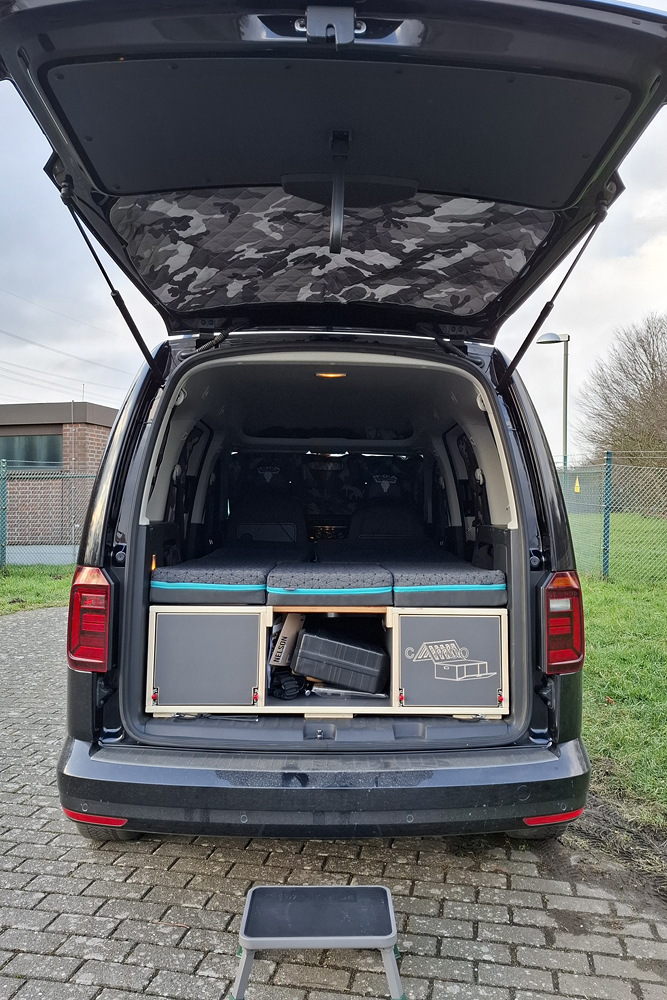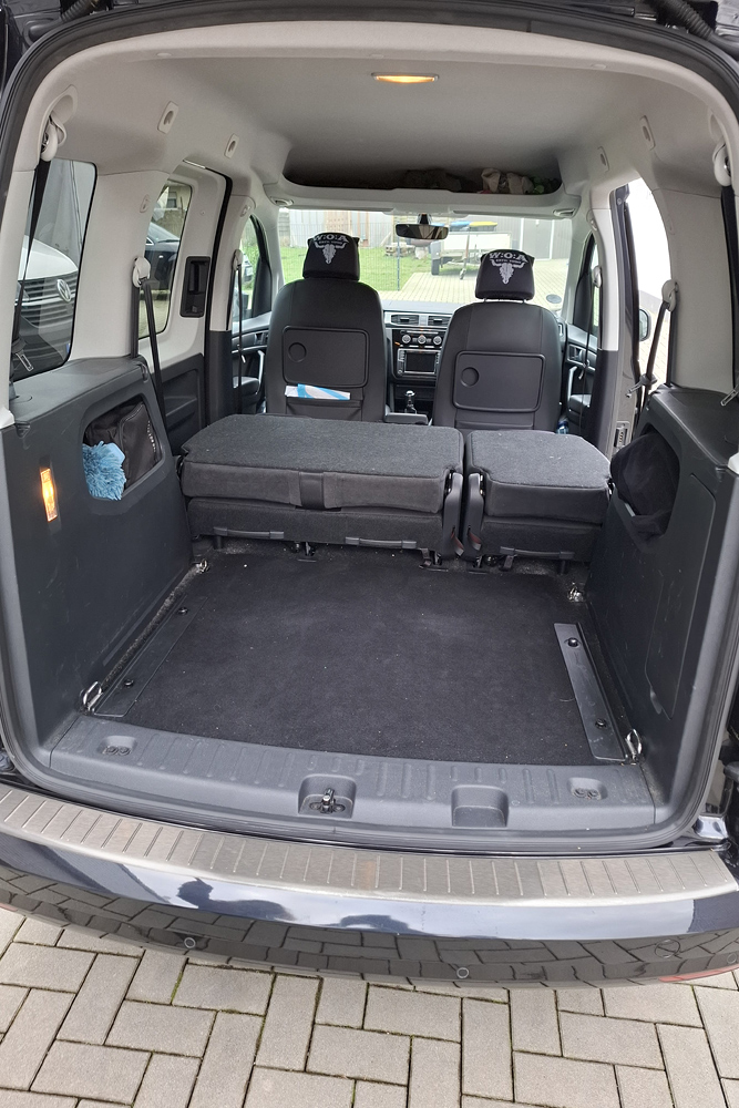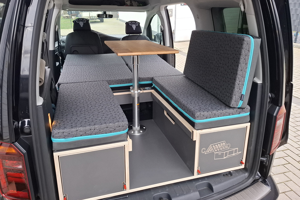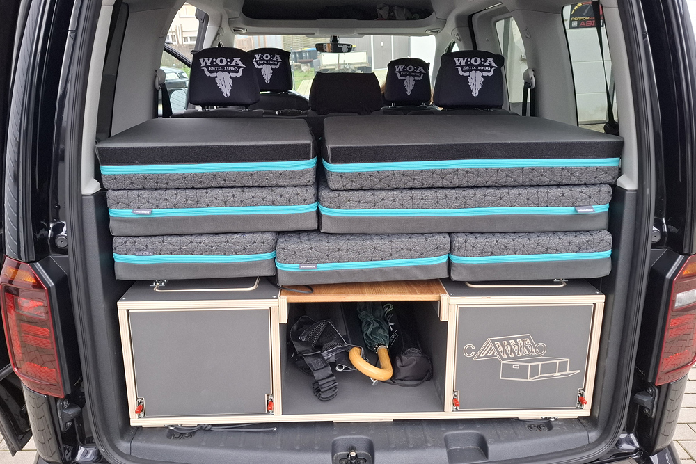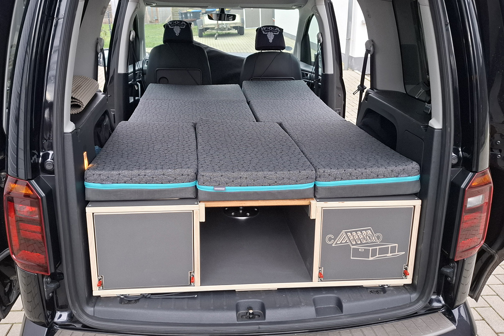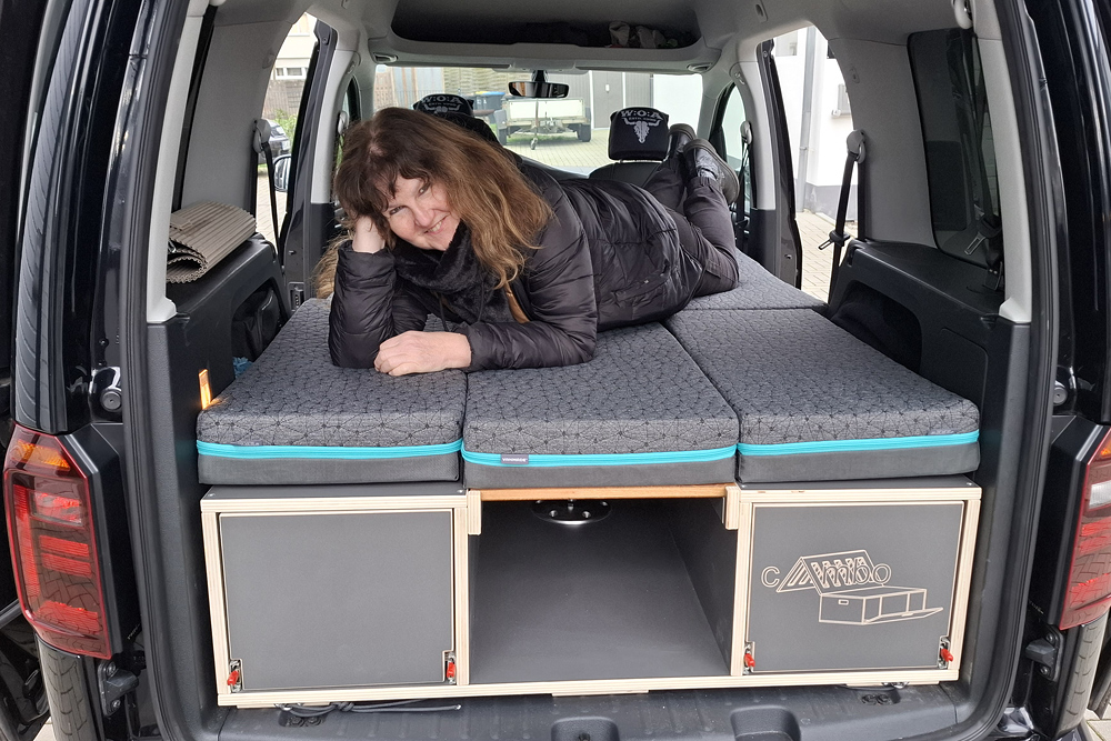 einen Topper gelegt und haben im Schlafsack geschlafen. Für ein bis zwei Übernachtungen kann man auch zu zweit im Caddy (1,15m Bettbreite)
