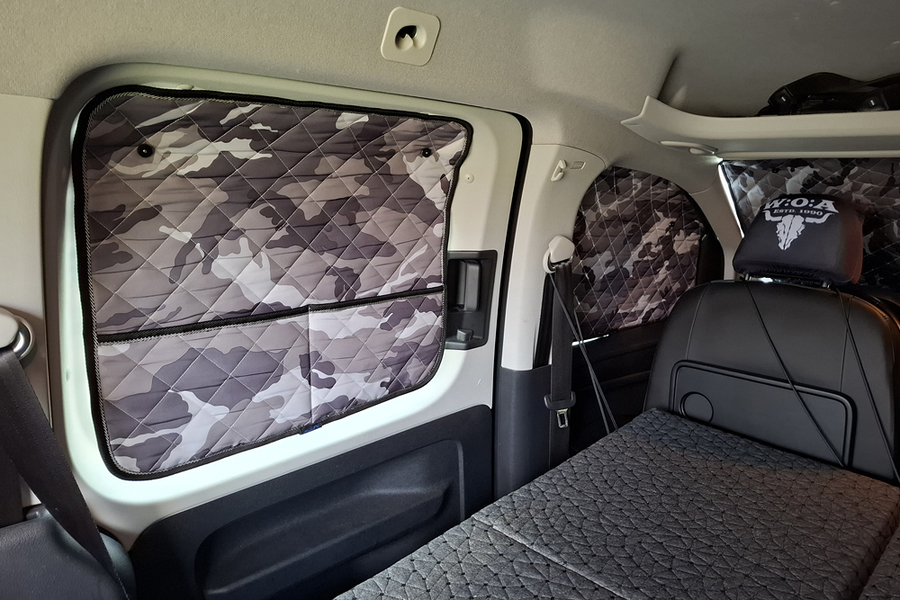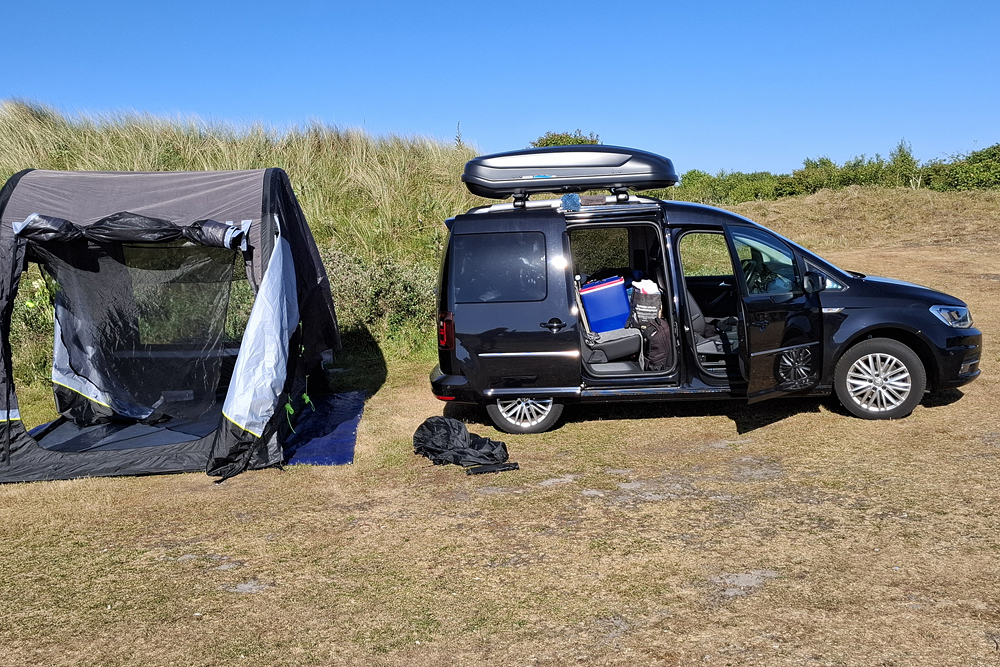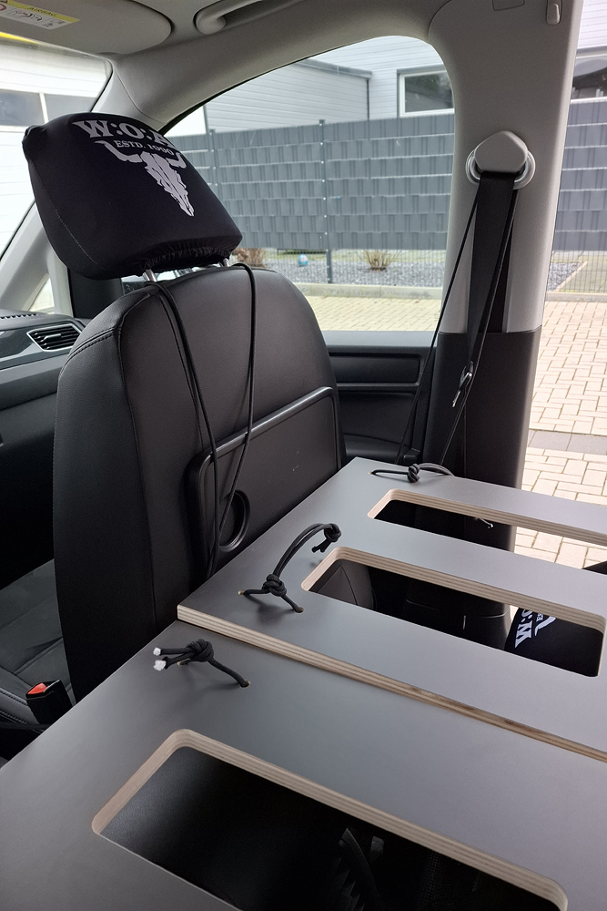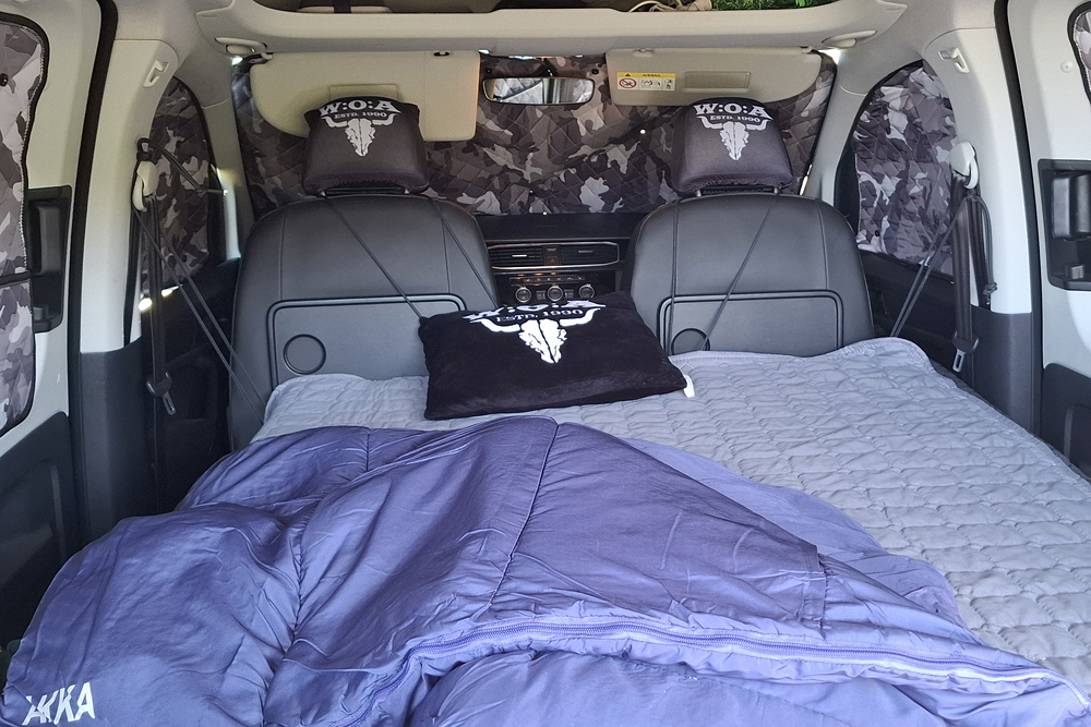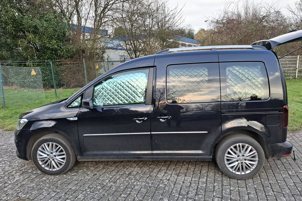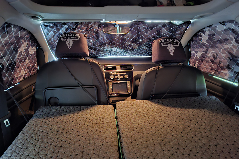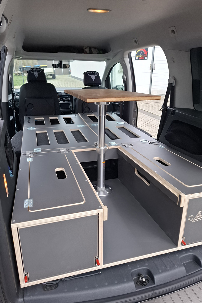 einen Topper gelegt und haben im Schlafsack geschlafen. Für ein bis zwei Übernachtungen kann man auch zu zweit im Caddy (1,15m Bettbreite)