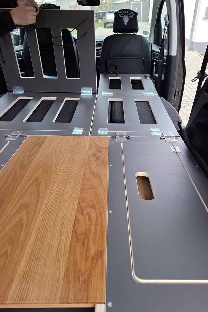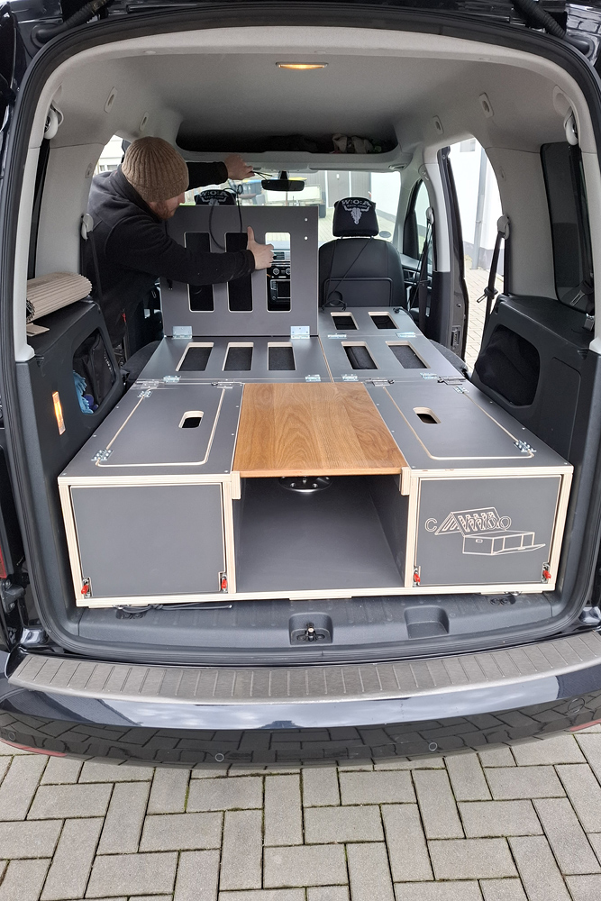 die Mitarbeiter wie die Box umgebaut werden muss, um dann im Auto schlafen oder frühstücken zu können.
