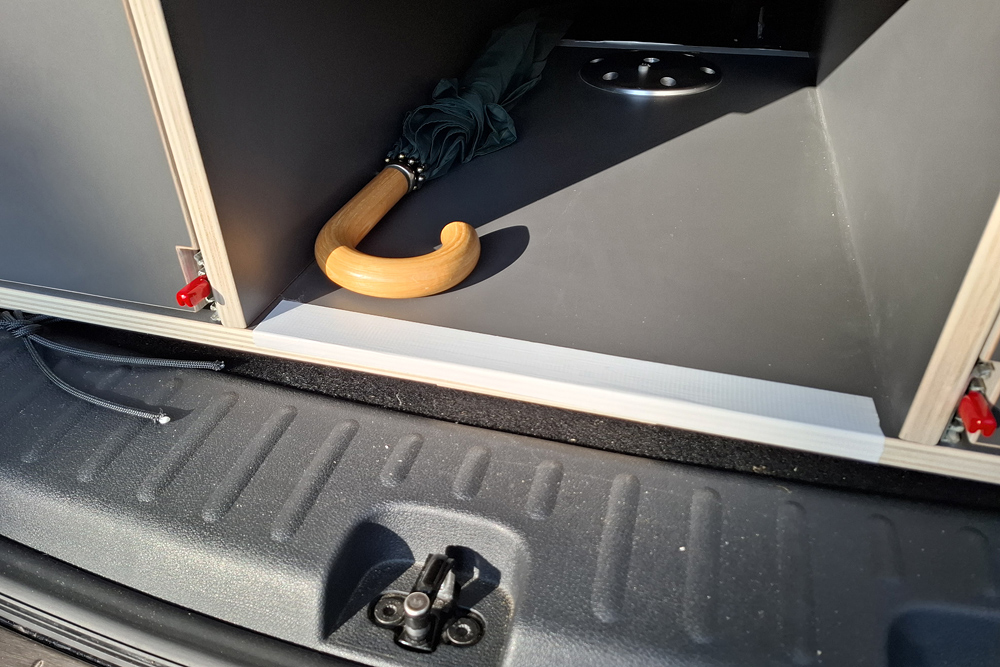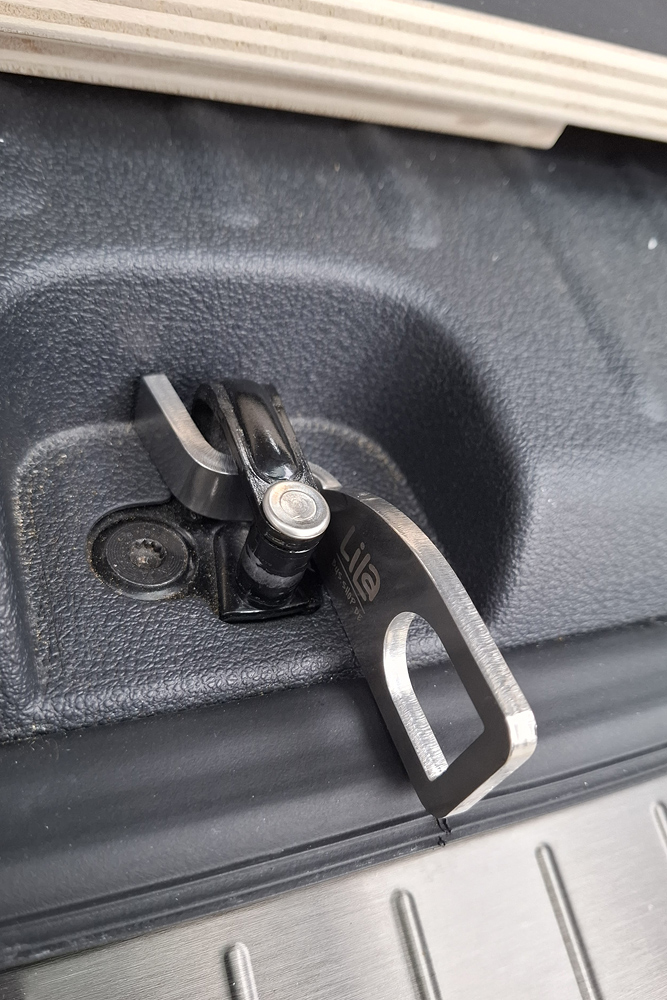 an der Heckklappe funktioniert es über eine Magnetleiste. Die vordere Kante der Box habe ich mit einem Klebeband gesichert,