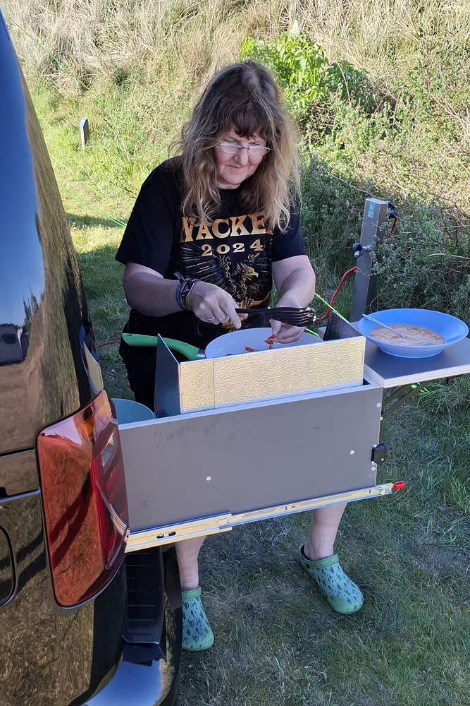 einen Tisch, eine Alu-Box für alle Kleinteile, eine Kühlbox mit 220 und 12 Volt Betrieb und ein Jetbag für das ganze Gepäck gekauft.