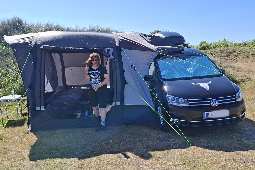 Fall empfehlen können. Als zusätzliches Campingmaterial haben wir uns ein aufblasbares Vorzelt, einen Gaskocher mit Windschutz, zwei Stühle,